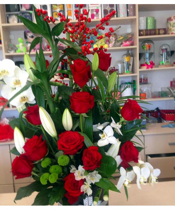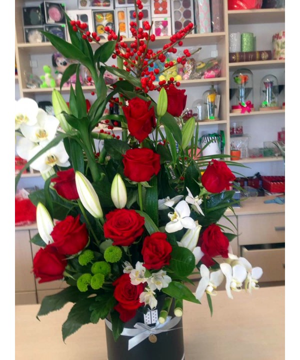 Aranjament floral de sezon creat de floristii 101flori.ro special pentru a putea fi oferit pe tot parcursul anului si potrivit pentru orice ocazie onomastica, zi de nastere sau orice aniversare, comanda online acest aranjament elegant pentru ziua femeii sau pentru ziua indragostitilor. O cutie cu trandafiri rosii si orhidee alba pentru ea, livrata in bratele ei direct din florarie prin curierii proprii va fi o amintire de neuitat.