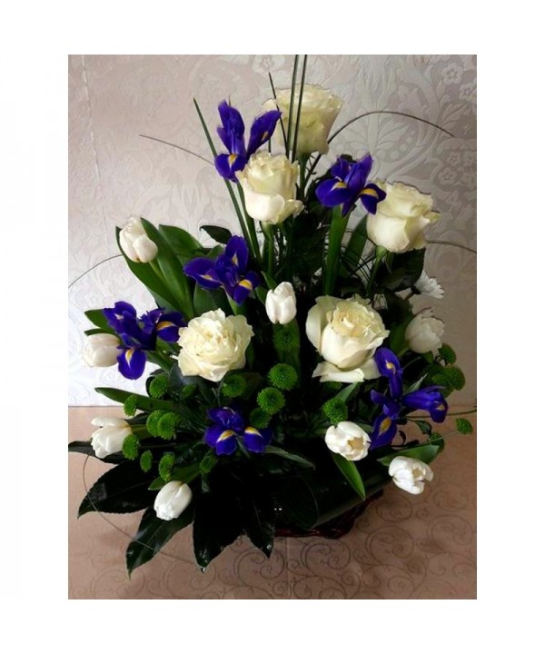 Aranjament floral in cos cu 5 trandafiri albi, 6 irisi, 9 lalele albe si 3 crizanteme yoko verzi, decorat cu verdeata eleganta Comanda online aranjament flori in cos cu livrare zilnica in Bucuresti si Ilfov