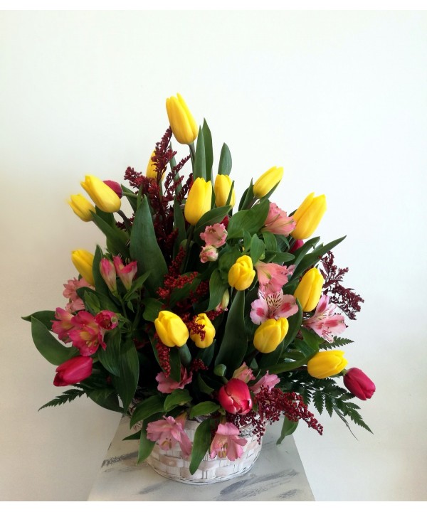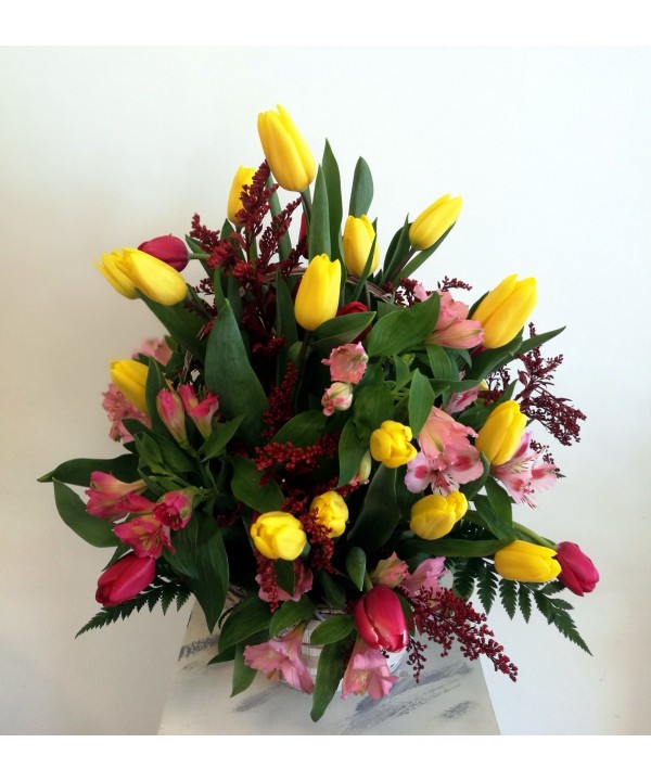Ofera un aranjament primavaratic cu lalele si alstroemeria frumos aranjate intr-un cosult pentru o persoana draga care isi serbeaza onomastica, ziua de nastere sau poate fi un cadou inspirat de multumire si apreciere prin care doresti sa-i spui multumesc.
