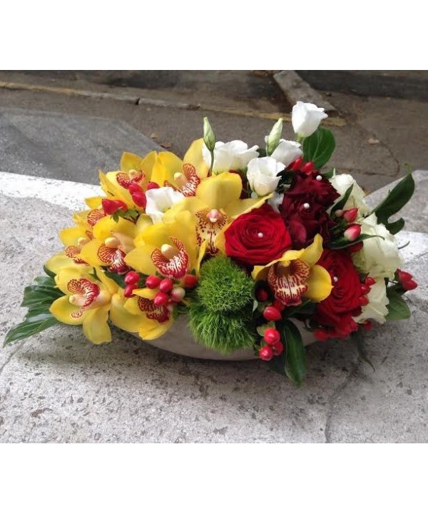 Comanda un aranjament special in vas cu orhidee cymbidium, trandafiri albi si rosii, lisianthus alb cu verdeata decorativa si hypericum.