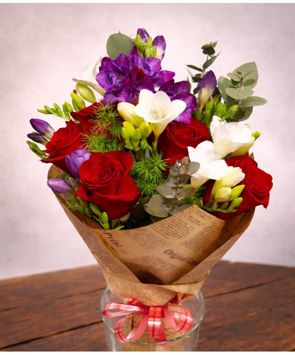 Buchet flori din 5 trandafiri rosii si 10 frezii colorate in ambalaj vintage din ziar. Comanda online buchet de flori cu livrare in Bucuresti si Romania zilnic, livrare la domiciliu direct din florarie prin reteaua noastra de florarii locale prin curieri proprii direct in bratele ei.