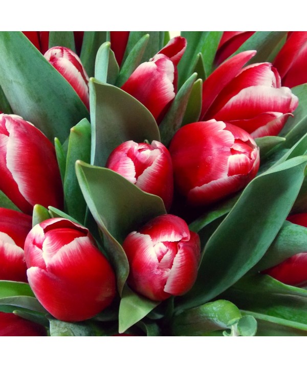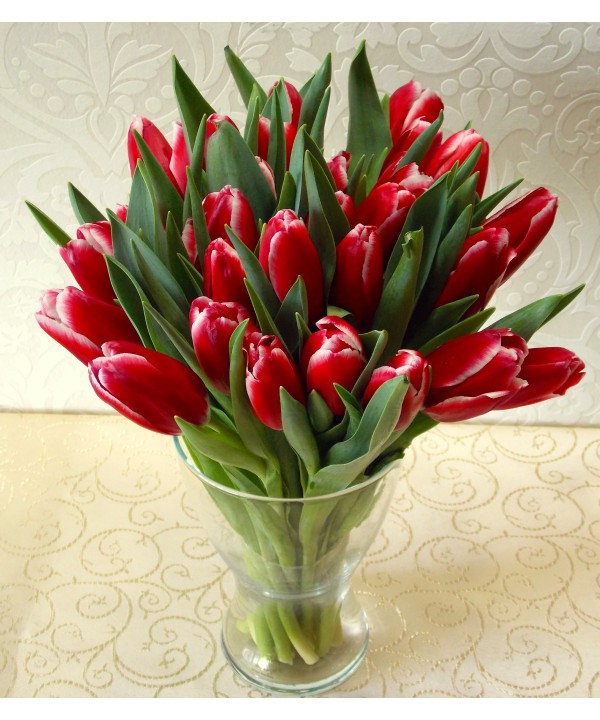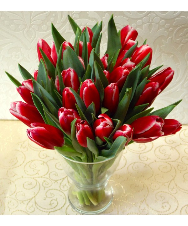 39 lalele rosii gingase si delicate aranjate intr-o vaza de sticla transparenta trimite cu livrare la domiciliu si o vei surprinde cu siguranta.