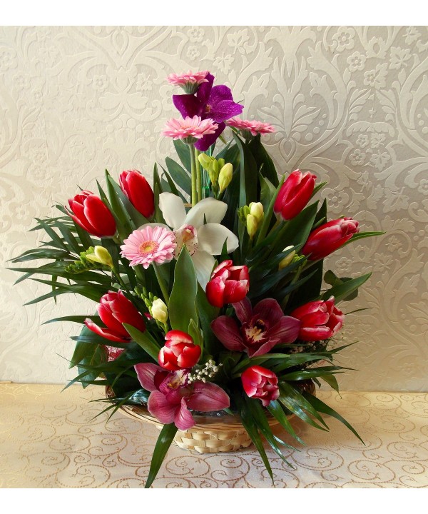 Un aranjament in cosulet cu flori de primavara lalele, frezii, gerbera combinat cu putin exotic prin cupele de orhidee cymbidium, comanda online si o vei suprinde cu aceasta combinatie colorata si exotica.