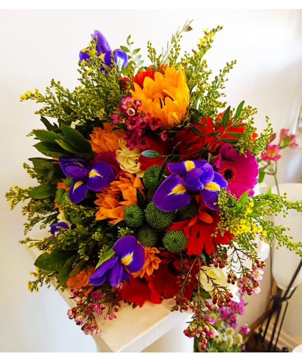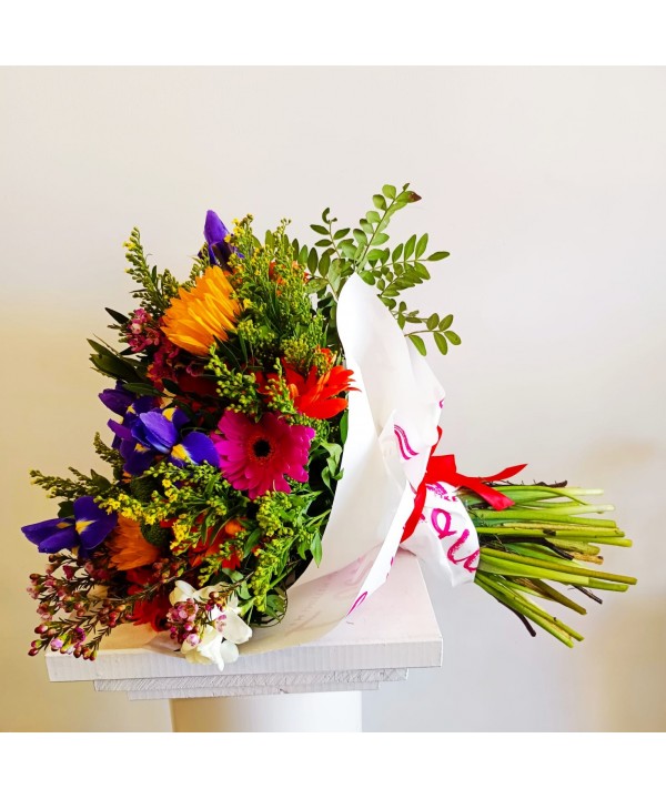 Comanda online un buchet de flori multicolor, intens colorat cu trandafiri,florarea soarelui, gerbera si alte flori cu multa verdeata decorativa si ambalaj imprejur. Surprize flori la domiciliu prin curierii nostrii cu livrare direct din florarie. Un buchet vibrant pentru orice ocazie zi de nastere, onomastica, diferite aniversari sau de multumire.