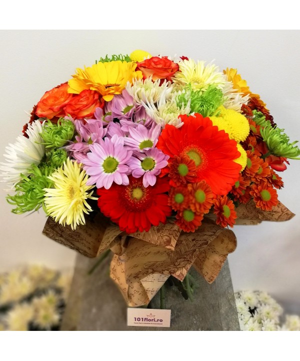 Ofera flori in dar de ziua onomastica, ziua de nastere sau pentru felicitare un buchet de flori viu colorate din trandafiri, mai multe specii de crizanteme si gerbera intr-o prezentare eleganta ambalat in ziar. Comanda buchet de flori colorate pentru mama, sotie sau prieteni cu livrare gratuita direct din florarie zilnic, flori proaspete din florarie la tine acasa.
