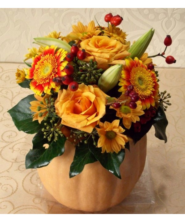 Aranjament floral de toamna realizat in dovleac natural cu trandafiri, gerbera, crizanteme si crin Comanda online aranjamente florale de toamna in dovleac natural si accesorii specifice acestui anotim cu livrare in Bucuresti maxim 4 ore.