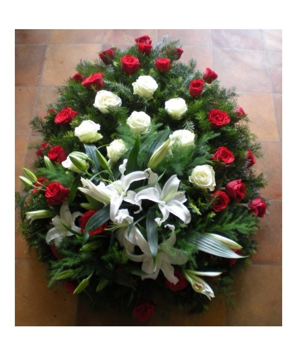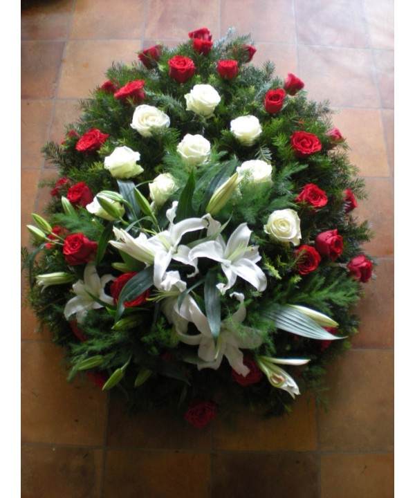Coroana funerara din 38 trandafiri si 6 cupe de crini pe suport din brad natural si panglica funerara. Comanda online coroana funerara din flori naturale cu livrare direct din florarie , livrare coroane la capela sau biserica in Romania in max 4 ore