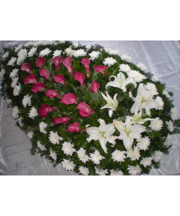 Coroana foarte deosebita cu 18 cale mov, 10 crizanteme si 6 cupe de crin albe