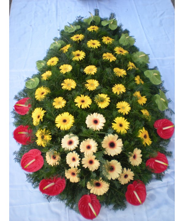 Coroana impresionanta din anthurium rosu si verde, gerbera galbene si crem pe suport de brad natural. Transmite condoleantele tale unei persoane dragi de care nu poti fi alaturi si comanda online coroana flori naturale cu livrare gratuita oriunde in bucuresti.