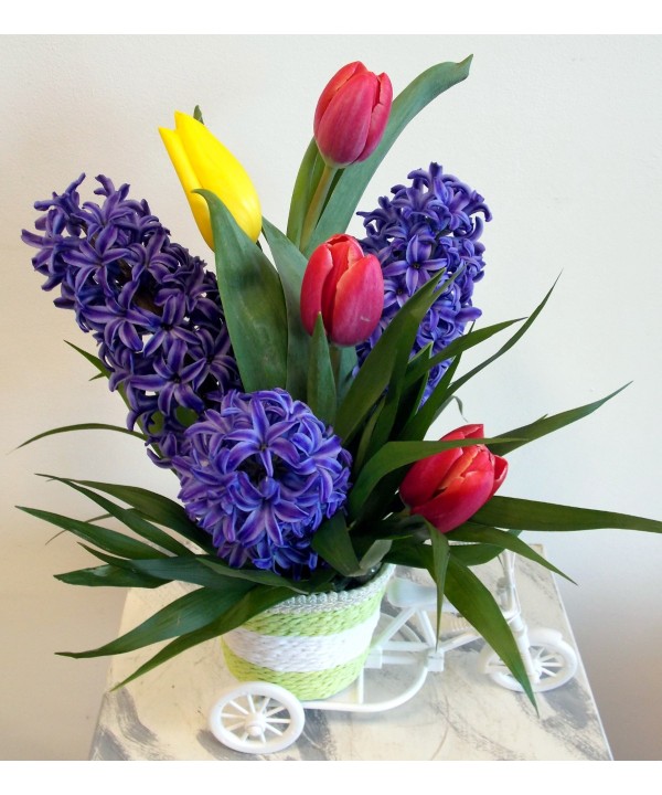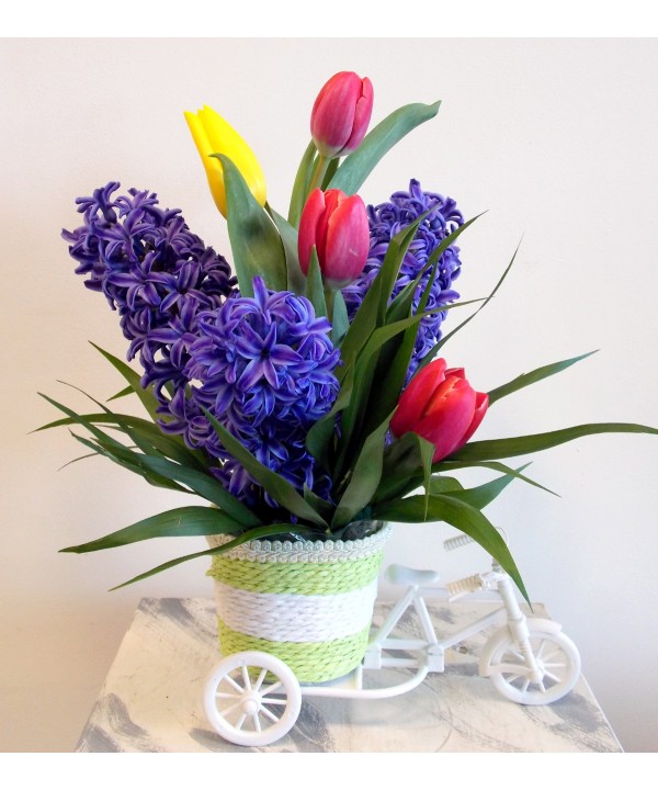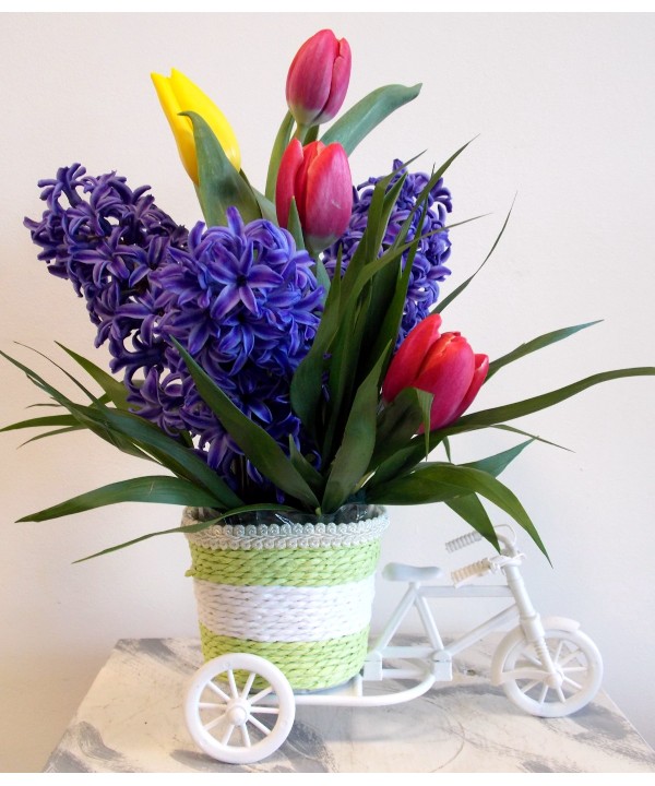 Aranjament de primavra pe bicileta cu zambile si lalele si verdeata decorativa. Comanda online un aranjament cadou de marisor sau 8 martie pentru femeia iubita.