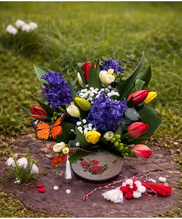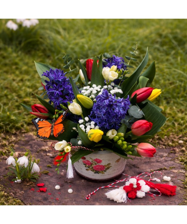 Un aranjament in cutie decoart floral de mana cu flori de primavara colorate frezii, lalele, zambile si decorat cu fluturas si snur de martisor special pentru 1 si 8 Martie.