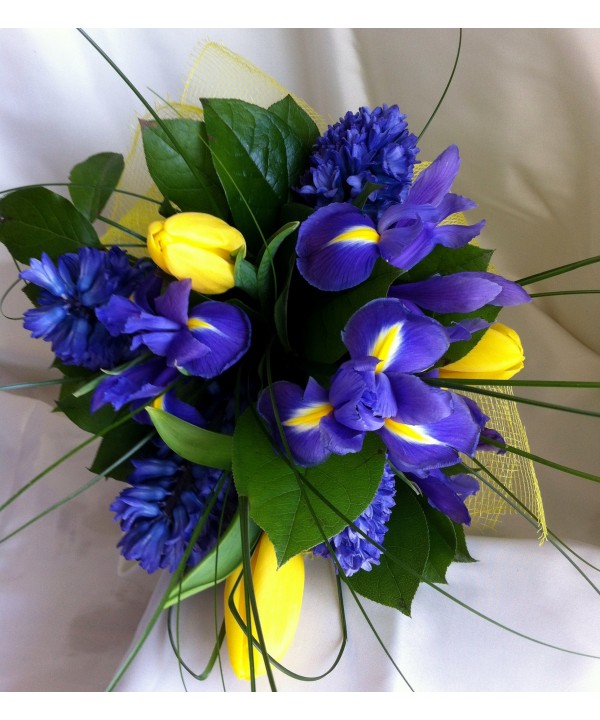 Buchet primavaratic cu zambile si irisi albastrii, lalele galbene cu frunze de salal si beargrass frumos ambalate intr-o plasa galbena. Ofera acest buchet de primavara de martisor sau 8 martie pentru o persoana la inceput de primavara.
