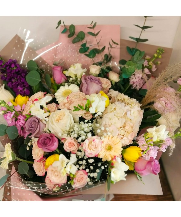 Ofera un buchet elegant si voluminos din flori multicolore atent alese pentru a se potrivi atat estetic cat si cromatic pentru ca experienta traita de persoana care i-l primeste sa fie plina de emotie si bucurie. Buchetul se realizeaza pe baza de comanda in ziua livrarii pentru a va oferii cele mai proaspete flori iar persoana care-l va primi se va bucura mai multe zile de cadoul primit. Buchetul se livreaza direct din florarie prin reteaua noastra de florarii locale din toata tara si prin intermediul curierilor proprii.
