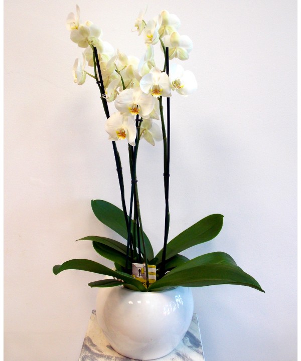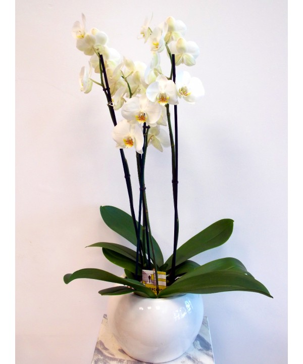 Daruieste un cadou special cu flori rezistente Orhidee Phalaenopsis alba cu 3 tije intr-un vas de ceramica elegant si deosebit. Inaltime aprox. 55-60cm.