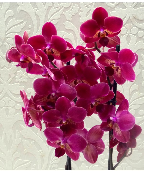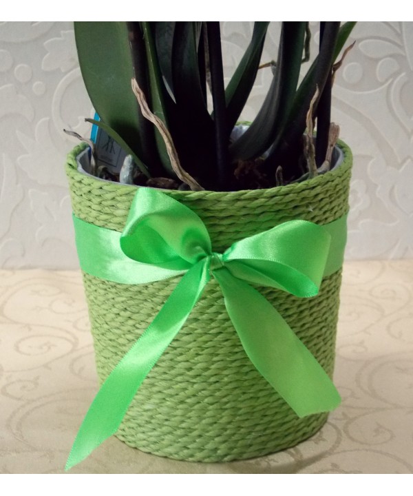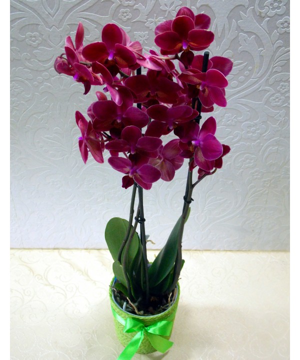 Surprinde intotdeauna prin eleganta si rafinament, planta de interior Orhidee Phalaenopsis grena cu 3 tije florale aranjata intr-un vas decorat manual cu spirale din rafie si funda satin. Inaltime aprox. 55-60cm.