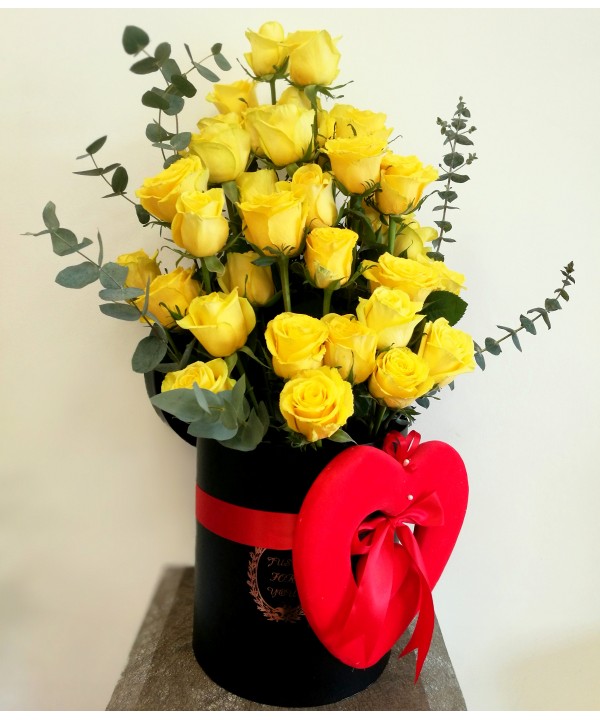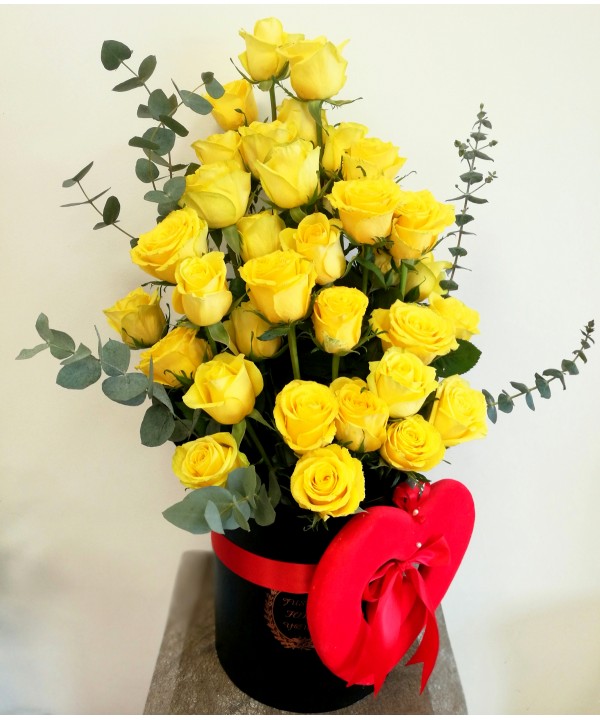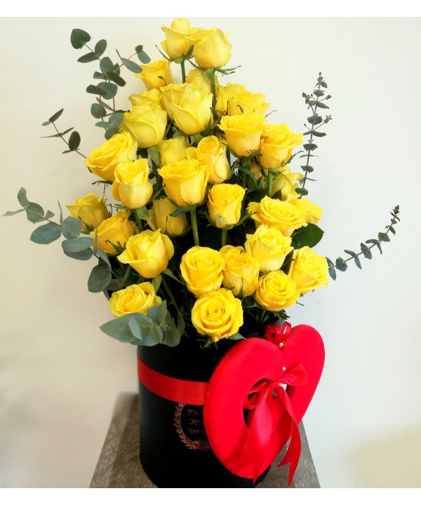 Ofera dragostea ta printr-un aranjament elegant in cutie neagra eleganta cu 35 trandafiri galbeni aranjati in scara, eucalipt, inima decorativa si frunda rosie din panglica satin.
